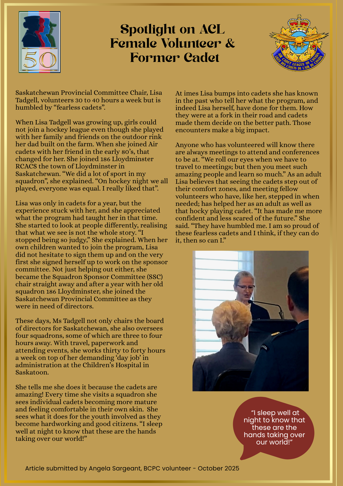 To mark the 50th anniversary of girls in the Cadets, each month, the Air Cadet League of Canada will be pleased to introduce you to a female former Cadet who is giving back to the community by volunteering within our organization: